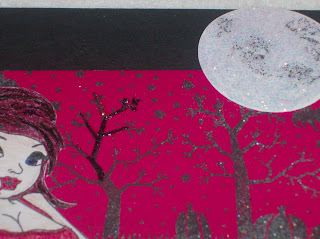 While I was coloring her I kept thinking of different ways to do the background of the card and then thought why not make it look like she was just sitting on the ground after having a little snack with the spooky skyline behind her with a big full moon, and ummmmm OOOPPPPSSSS is that a little trickle of blood remaining from her snack...oh well it's a good thing she is wearing "blood" red anyway!!!